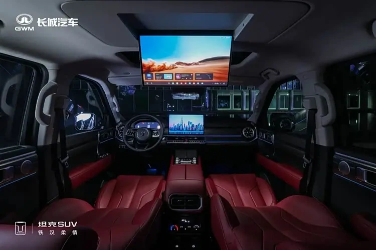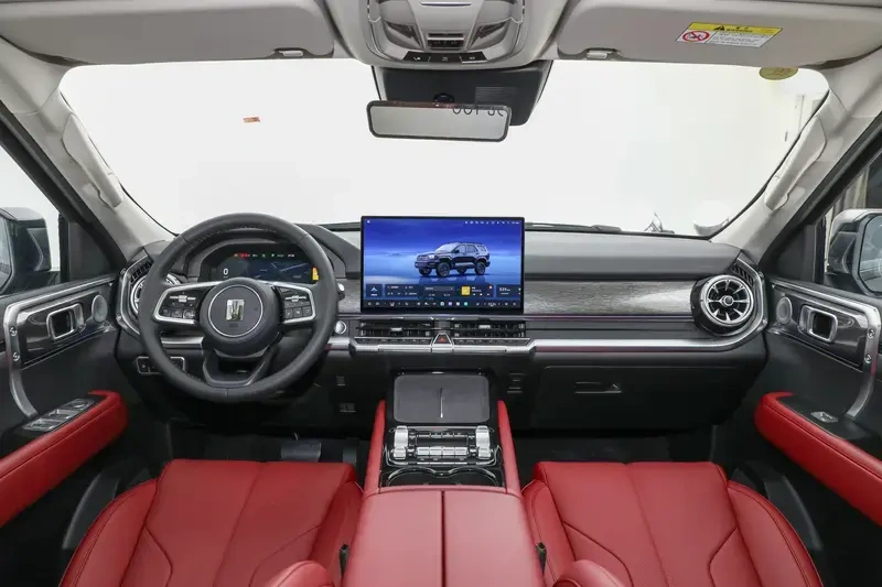 新车采用了机甲数字座舱设计,中控台配备12.3英寸全液晶仪表和15.6英寸悬浮式中控屏,内置长城最新的车机系统。此外,新车还采用了怀挡式换挡机构。其余配置方面,新车搭载手机无线充电面板、HUD抬头显示、流媒体内后视镜、15.6英寸后排吸顶屏以及车载冰箱等。
