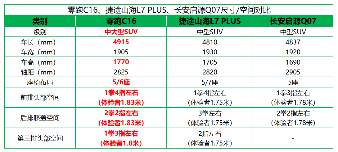 从尺寸和乘坐体验来看,零跑C16的优势确实比较明显。4.915米的车长摆在那里,纵向空间本身就有优势,前两排的坐姿都比较舒展,不会有“顶头”“顶腿”的压迫感。更难得的是,它的第三排,对成年人也很友好,这在同价位确实不多见,算是真正能用的 6 座。反观长安启源 Q07,空间本身够用,但只有 5 座布局,超过5个人出门,就显得不够灵活。捷途山海 L7 PLUS 虽然有 7 座可选,但第三排更偏向短途应急。所以如果你的家庭有多人出行、老人接送、长途旅行的需求需求,那零跑C16的空间表现和口碑确实更占优.势。