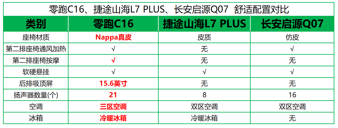 捷途山海 L7 PLUS、长安启源 Q07 为仿皮座椅,第二排座椅没有按摩功能;零跑 C16 用的是 Nappa 真皮座椅,第二排提供加热、通风、按摩功能,还配软硬悬挂。对于家里有老人小孩、经常跑高速或长途的用户来说,二排按摩+通风+软硬悬挂,对舒适性提升非常明显。不过有一说一,也有车友提了不足:车子未配备二排腿托,长途旅行腿部支撑还不够。也就是说零跑C16 的二排座椅的舒适性,在 15 万级别里有一定优势,但使用层面依旧有提升空间。