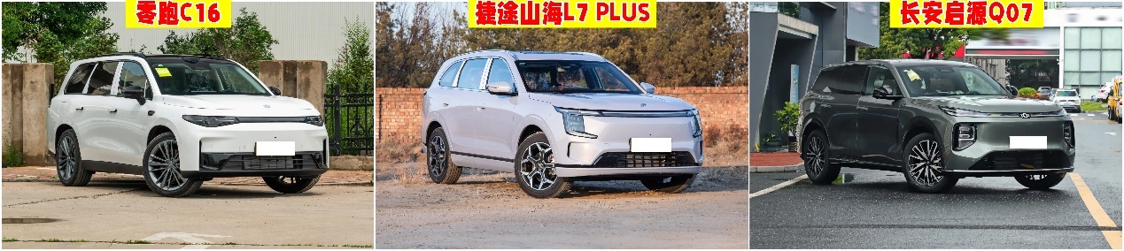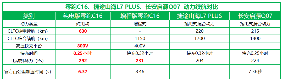 而长安启源Q07搭载的是1.5T 150马力 L4 插电式混动系统,电动机总马力224Ps,电动机马力略逊于零跑C16增程版。而捷途山海L7 PLUS搭载的是1.5T 156马力 L4 插电式混动系统,电动机总马力204Ps,电动机马力稍弱于前两者,而且没有纯电版车型。比较下来,零跑 C16 的动力策略比较全面,纯电版开起来动力足,加速带劲,还支持快充,可以轻松上下班、接送孩子。而增程版就更安心了,长途出行不用担心没电,续航带劲。相比只提供插电式混动系统的捷途山海L7 PLUS、长安启源Q07车型,零跑C16让家庭用户有更多选择。