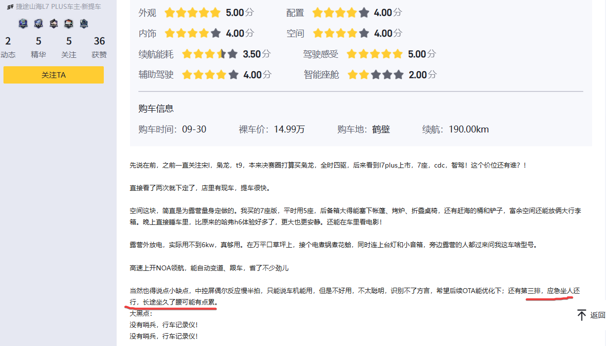 有车主反馈:第三排应急坐人还行,长途坐久了,腰可能有点累。所以,从整体空间逻辑来看,捷途山海 L7 PLUS 的 7 座更像是给“偶尔需要多一两个座位”的家庭准备的,适合短途代步或孩子乘坐;但要说经常拉满员跑长途,它的第三排舒适度还是不太够。