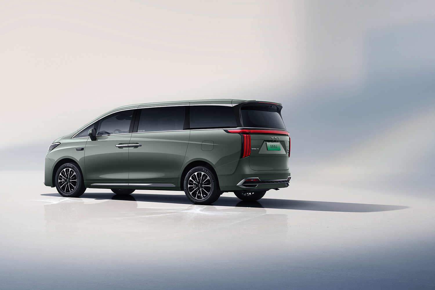 侧面整体造型较为简洁,采用熏黑D柱营造出悬浮式车顶的效果。车身的长宽高分别为5050、1960、1900mm,轴距3085mm。虽然只是高山家族中最小的成员,但高山7的长度与轴距依然超过了5m和3m,比丰田埃尔法大了一圈。