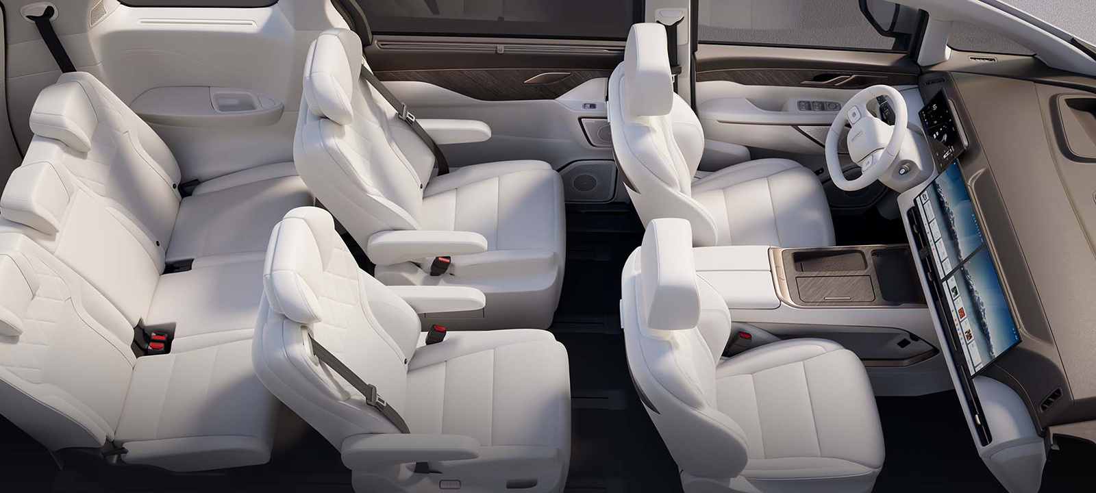 车内采用2+2+3的7座布局,拥有61.1%的得房率,纯平地板设计配合二三排共轨技术,让座椅布局灵活可调。全车座椅均采用NAPPA真皮座椅,其中前两排座椅提供加热、通风、按摩等功能,第二排还配有0重力座椅。