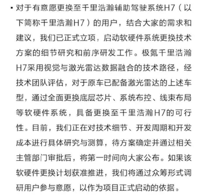 值得一提的是,对于2025款极氪001的老车主,极氪官方也已经发布公告称,配备激光雷达的老款极氪001具备更换至千里浩瀚H7的可行性,并表示目前正在对技术细节、开发周期和开发成本进行具体研究与测算,待方案确定并通过相关主管部门审批后向外界公布。如果该软硬件更换计划获准推进,极氪将通过众筹形式调研用户参与意愿,作为项目正式启动的依据。