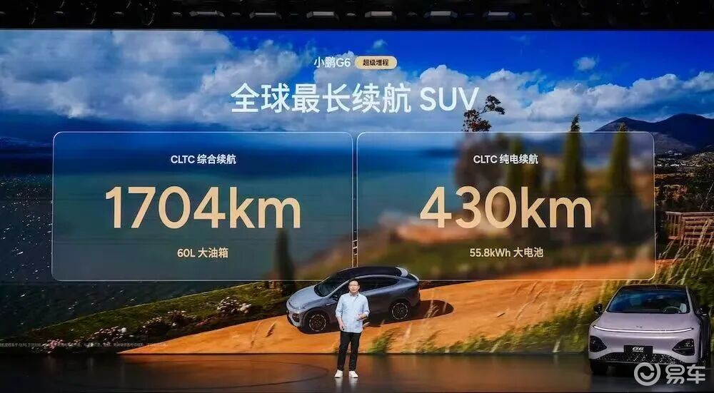 小鹏G6增程版由东安1.5T发动机作为增程器,最大功率110kW,匹配最大功率218kW后置单电机,同时采用55.8kWh的磷酸铁锂电池组,其CLTC纯电续航里程为430km,配合60L大油箱,综合续航可达1704km。