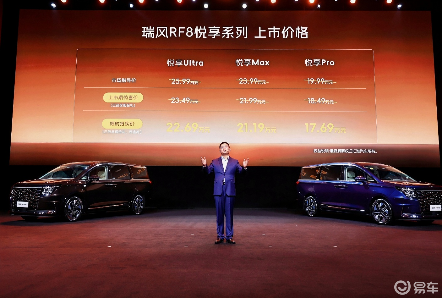 这25年,是瑞风与用户双向奔赴的历程。从2002年第一台瑞风下线定义中国MPV市场,到如今瑞风RF8悦享系列的焕新登场,瑞风始终与用户站在一起。活动现场,没有冗长的官腔,只有老车主的真实故事和重逢的泪水。外场的“时光市集”唤醒了25年的品牌记忆,内场的每一个环节都在诉说着“用户才是主角”。为了回馈这份长久的陪伴,瑞风此次拿出了十足的诚意:瑞风RF8悦享系列正式公布限时抢购价17.69万元起,并推出Pro、Max、Ultra三个版本,旨在让“全能满配”的高端出行体验不再遥不可及。