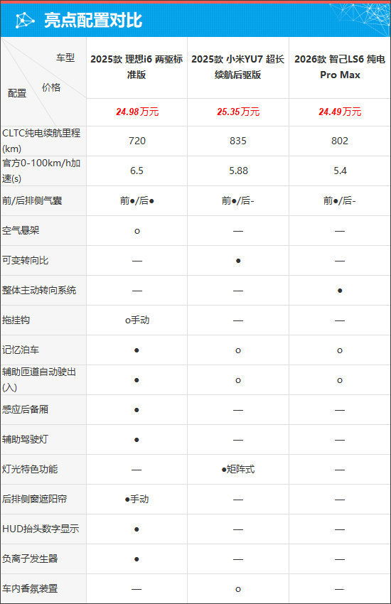 具体到车辆配置层面,通过对比来看,理想i6显然更加丰富一些。其独享后排侧气囊、感应后备厢、辅助驾驶灯、手动后排侧窗遮阳帘、HUD抬头数字显示以及负离子发生器,并且提供空气悬架和手动拖挂钩功能的选装,用车体验十分出色。相比之下,小米YU7独享可变转向比和矩阵式大灯,智己LS6独享整体主动转向系统,二者的亮点配置均较理想i6逊色一些。