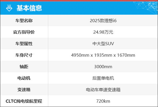 理想i6仅推出1款车型,售价24.98万元,动力采用后置单电机,官方百公里加速为6.5s,CLTC纯电续航720km。与此同时,新车可以选装前置单电机,百公里加速提升至4.5s,CLTC纯电续航660km。此外,2025年10月31日24:00前确认订购的理想i6用户,将享受10,000元的现金减免权益,以及双腔魔毯空气悬架、智能冷暖双用冰箱、全车静音电吸门的免费赠送权益,限时首销权益可与其他权益叠加使用(详情请咨询当地经销商)。