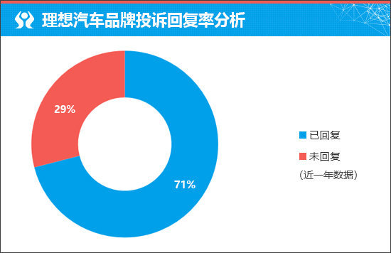 在衡量新车售后服务口碑方面,我们将通过企业对于车主投诉的回复情况进行分析,相对客观地对于新车未来的售后服务口碑有所预判。据车质网数据显示,近一年理想汽车品牌投诉回复率为71%,可见厂家对于车主的诉求重视程度有待提升。