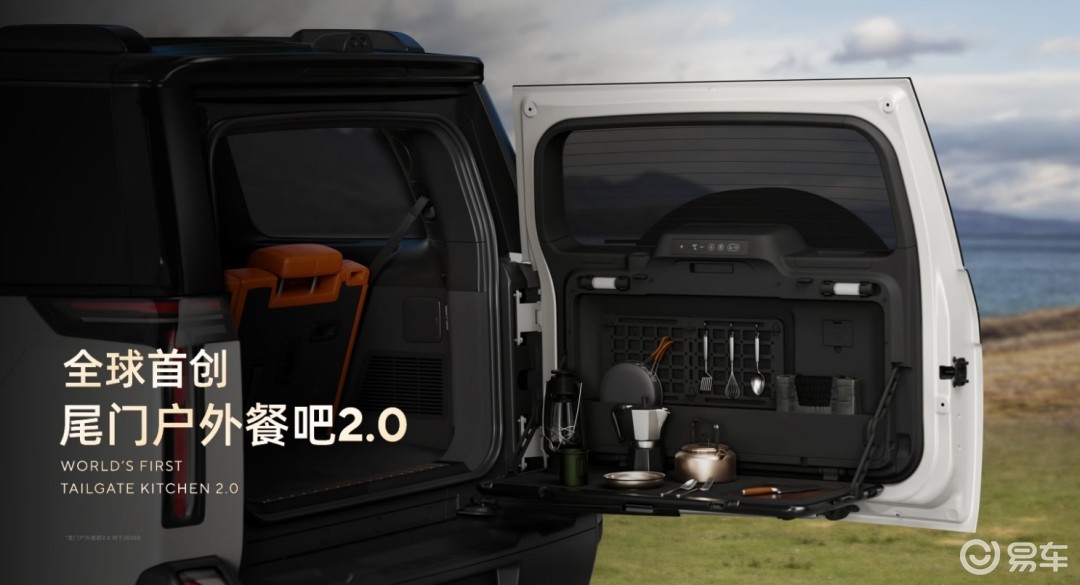 车尾部分,整体造型方正稳重,尾门集成户外餐吧2.0系统,配备折叠操作台与LED照明,完美衔接户外生活场景。