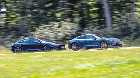 在乡道上,Lucid令人惊讶地拥有很长的悬挂行程。别急着联想到老派美式“摇船”——前双叉臂,后多连杆,加上偏硬的自适应减震。即便是钢制悬挂(Bilstein提供),车身控制依旧出色,不易被起伏路面扰乱。而对于德国工程,在这里早已拉开差距。Taycan拥有当前电动车中最出色的底盘系统之一:空气悬挂、无防倾杆、每个车轮可独立施压或抬升。结果是——即便单侧压过路肩,车身依旧稳如磐石。