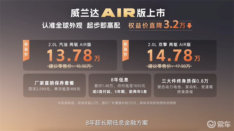 其实,新一代威兰达已经于2025年11月21日广州车展上市,9个版本售价16.98万-23.08万元,超配换购价15.98万-22.08万元。其中,就包括此次推出的两个入门版本,价格也与此次公布的建议零售价一致:2.0L汽油AIR版售价16.98万元、2.0L混动AIR版售价17.98万元。时隔三个月大幅降价3.2万元还是有些出人意料。