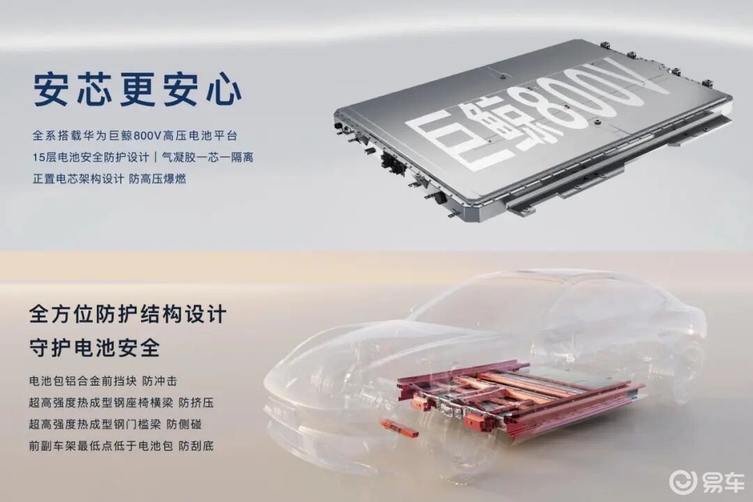 动力方面,纯电版搭载华为巨鲸电池平台,全系标配100kWh三元锂电池包,CLTC续航最高760km;增程版CLTC综合续航最高1605km,纯电续航最高355km,百公里亏电油耗低至5.9L。