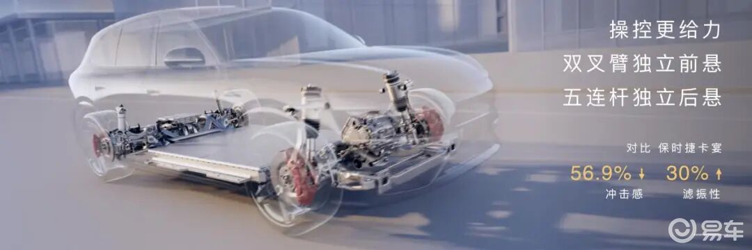 底盘搭载华为途灵平台,采用前双叉臂+后五连杆独立悬架、CDC连续可变阻尼减振器,高配版升级空气悬架,四驱版可选装前245mm、后275mm高性能鸳鸯胎,麋鹿测试成绩达86.2km/h。