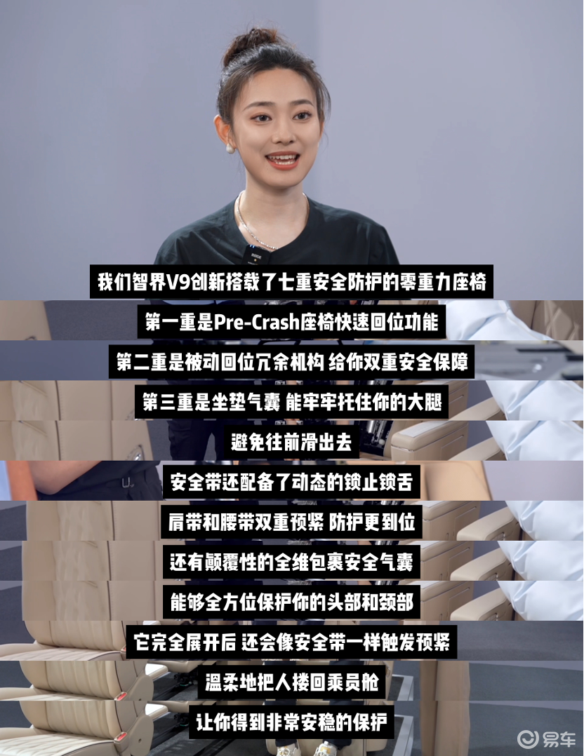 但极致舒适的背后,藏着对安全的全方位考量。本次直播中半剖座椅展具首次公开,让外界看到智界V9七重安全技术构建的从头部到臀腿的立体防护网。碰撞发生前,座椅主动回位Pre-Crash技术率先从躺姿回调至安全角度;碰撞瞬间,坐垫气囊向上托住大腿与臀部,防止身体下潜;集成式安全带与腰部收紧器将躯干牢牢固定;全维包裹安全气囊从头颈到胸部形成环绕保护;织带同步收紧让防护更贴合。从姿态调整到身体约束再到气囊包裹,完整覆盖零重力躺姿下的每一处安全盲区。